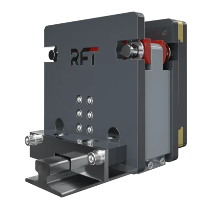 Abraçadeira/freio de trilho acionado hidraulicamente para proteção de sistemas em trilhos contra movimentos indesejados, como durante tempestades ou ventos fortes.